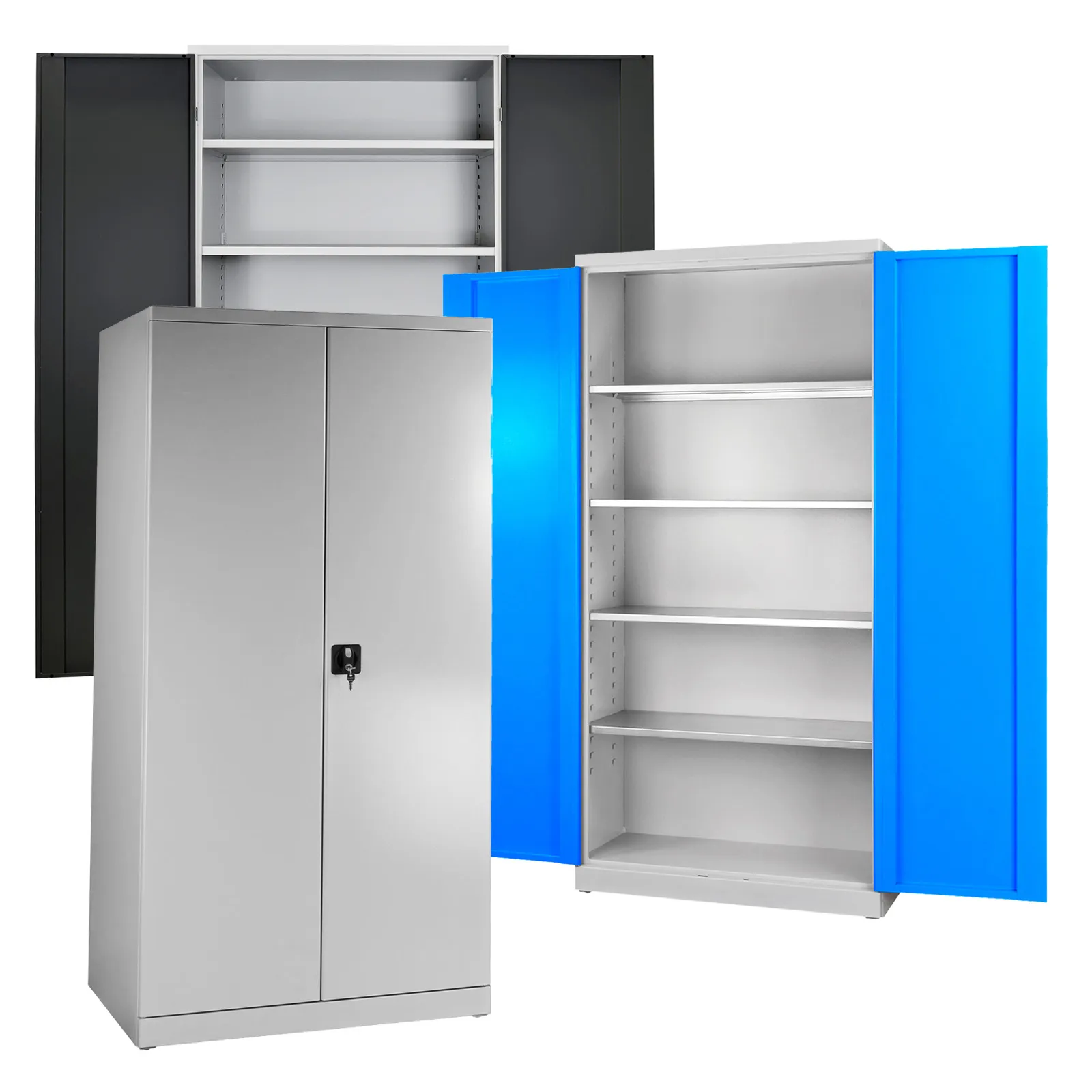 Der Schrank besteht aus einer stabilen Stahlblechkonstruktion und ist in drei eleganten Farben erhältlich: Lichtblau (RAL 5012), Lichtgrau (RAL 7035) und Anthrazitgrau (RAL 7016).