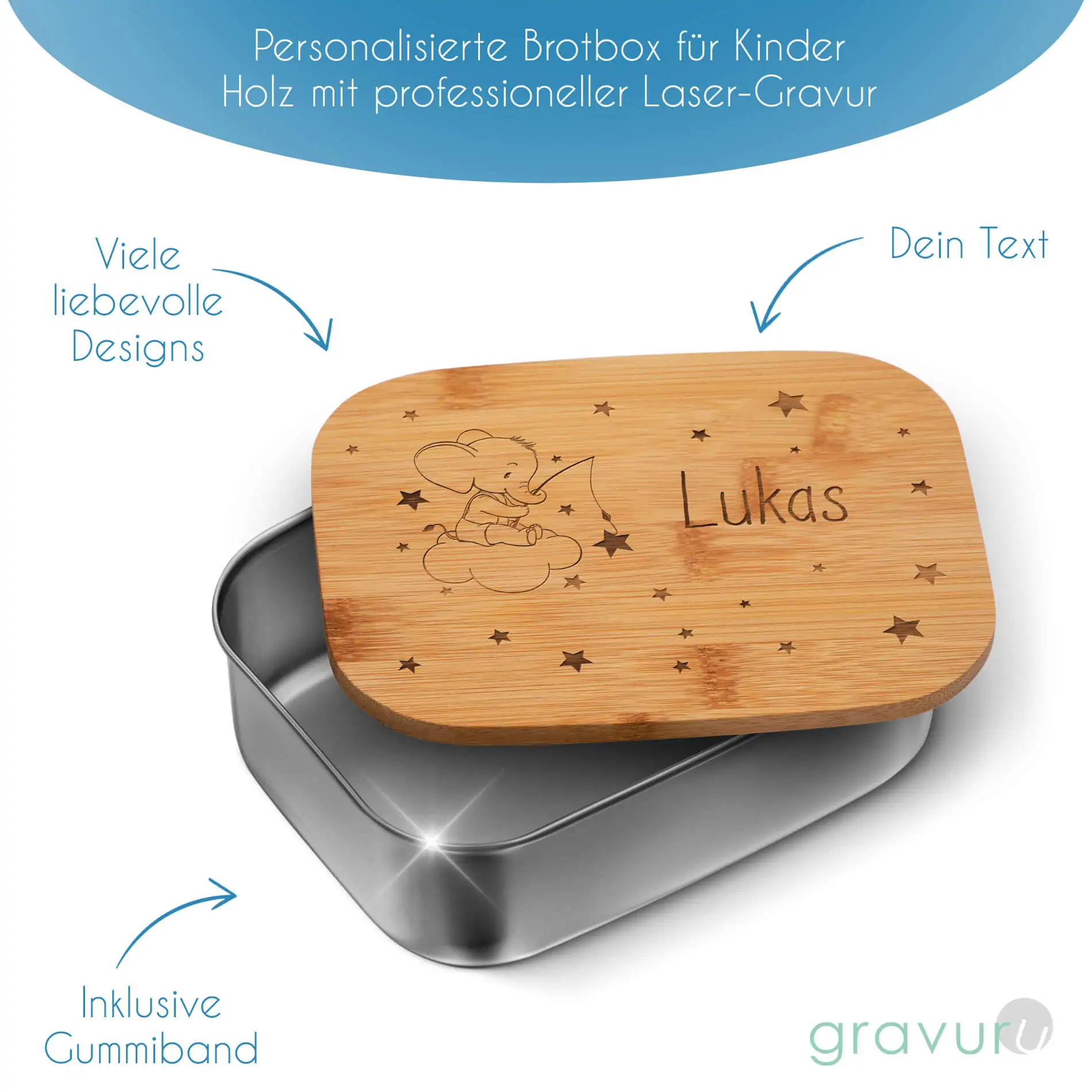 Jede Brotdose mit Holzdeckel wird in unserer hauseigenen Manufaktur professionell graviert. Bitte beachte, dass Holz als natürliches Rohprodukt eine unterschiedliche Maserung aufweist. Dementsprechend fällt auch jede Gravur anders aus – hier kann es zu Farbabweichungen kommen.